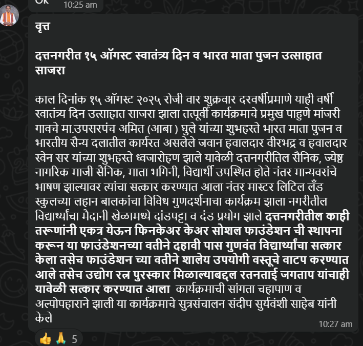 काल दिनांक १५ ऑगस्ट २०२५ रोजी वार शुक्रवार दरवर्षीप्रमाणे याही वर्षी स्वातंत्र्य दिन उत्साहात साजरा झाला तत्पूर्वी कार्यक्रमाचे प्रमुख पाहुणे मांजरी गावचे मा.उपसरपंच अमित (आबा ) घुले यांच्या शुभहस्ते भारत माता पुजन व भारतीय सैन्य दलातील कार्यरत असलेले जवान हवालदार वीरभद्र व हवालदार स्वेन सर यांच्या शुभहस्ते ध्वजारोहण झाले यावेळी दत्तनगरीतिल सैनिक, ज्येष्ठ नागरिक माजी सैनिक, माता भगिनी, विद्यार्थी उपस्थित होते नंतर मान्यवरांचे भाषण झाल्यावर त्यांचा सत्कार करण्यात आला नंतर मास्टर लिटिल लँड स्कुलच्या लहान बालकांचा विविध गुणदर्शनाचा कार्यक्रम झाला नगरीतील विद्यार्थ्यांचा मैदानी खेळामध्ये दांडपट्टा व दंड प्रयोग झाले दत्तनगरीतील काही तरूणांनी एकत्र येऊन फिनकेअर केअर सोशल फाउंडेशन ची स्थापना करून या फाउंडेशनच्या वतीने दहावी पास गुणवंत विद्यार्थ्यांचा सत्कार केला तसेच फाउंडेशन च्या वतीने शालेय उपयोगी वस्तूचे वाटप करण्यात आले तसेच उद्योग रत्न पुरस्कार मिळाल्याबद्दल रतनताई जगताप यांचाही यावेळी सत्कार करण्यात आला कार्यक्रमाची सांगता चहापाण व अल्पोपहाराने झाली या कार्यक्रमाचे सुत्रसंचालन संदीप सुर्यवंशी साहेब यांनी केले